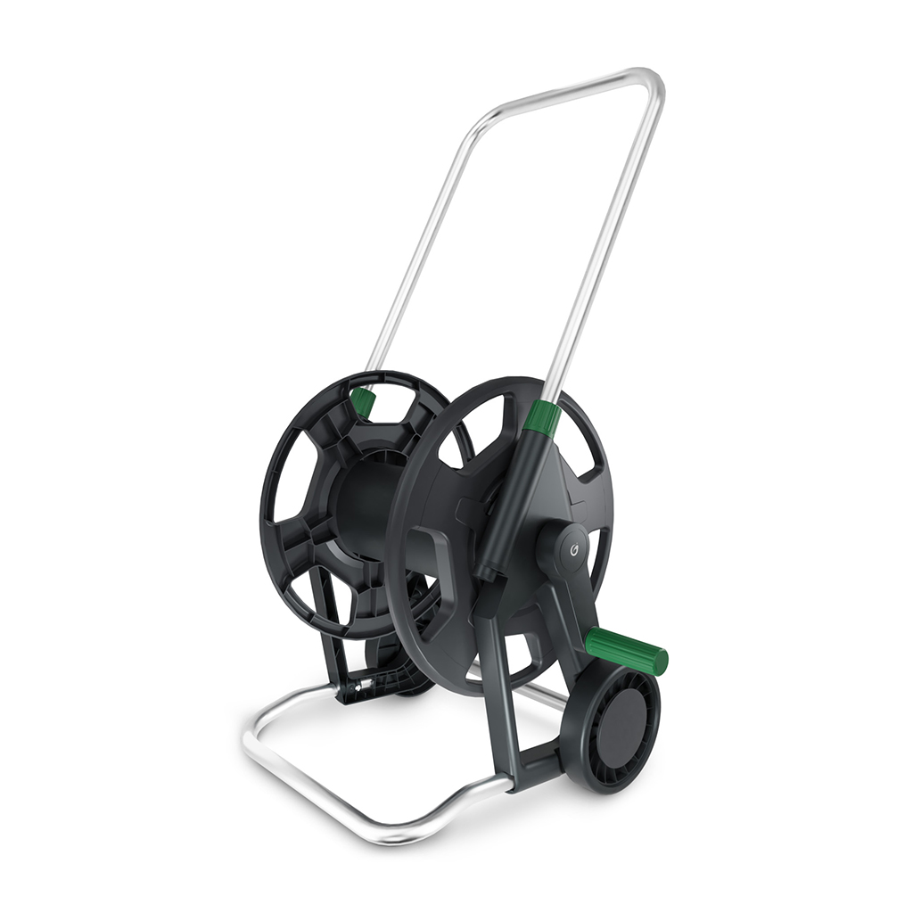 Rulla med dig slangvagnen i trädgården. Med ett frigående handtag rullar du enkelt upp trädgårdsslangen för förvaring. Slangvagnen har en kapacitet att förvara 60 m 1/2″ eller 30 m 3/4″ slang.