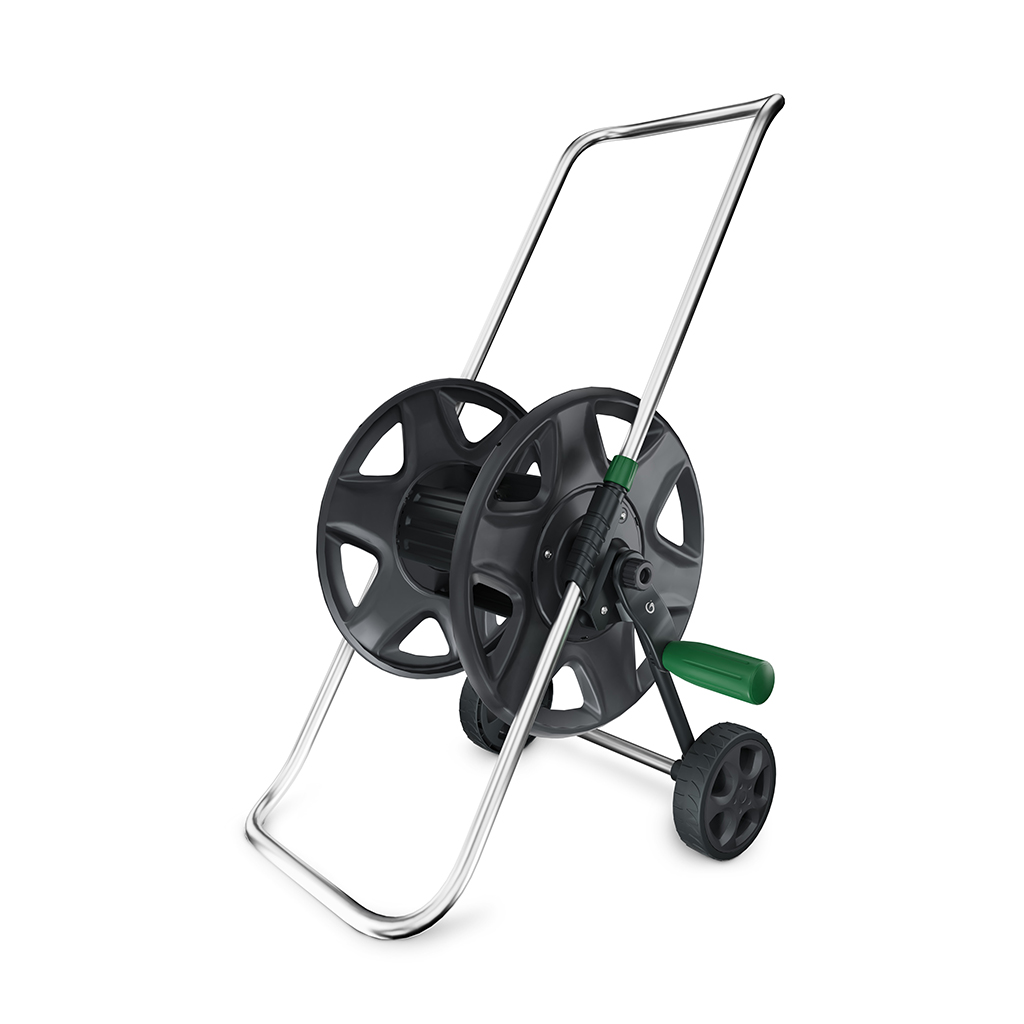 Rulla med dig slangvagnen i trädgården. Med ett frigående handtag rullar du enkelt upp trädgårdsslangen för förvaring. Slangvagnen har en kapacitet att förvara 60 m 1/2″ eller 30 m 3/4″ slang.